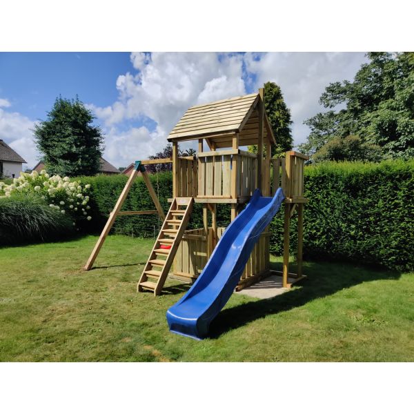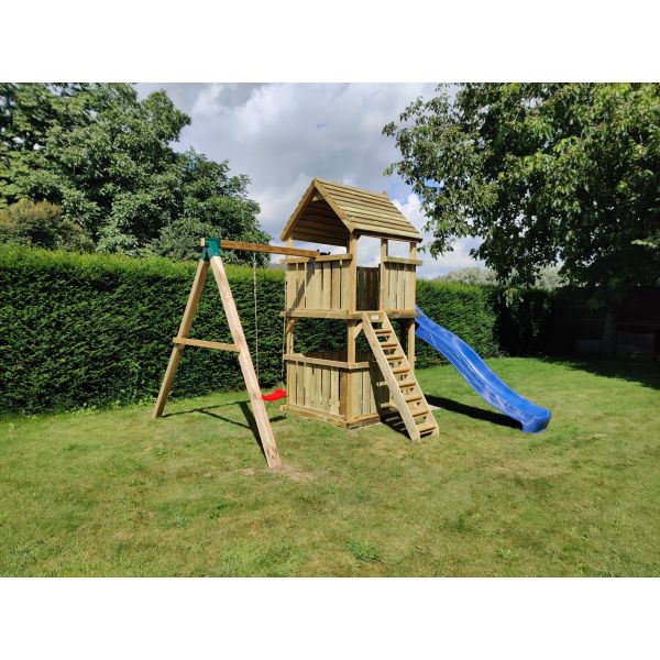 Het speeltoestel is geschikt om uit te breiden met een aanbouwschommel, klimwand of brandweer glijstang.