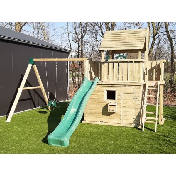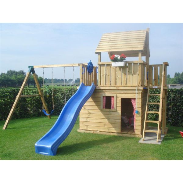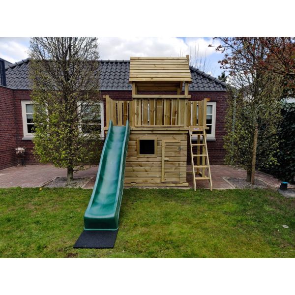 Standaard wordt dit speeltoestel uitgevoerd met een trap met handrails rechts aan het smalle balkon en glijbaan aan het linkse balkon. Het speelhuisje is uitgevoerd met 2 ramen en een deuropening. Deuropening en het raam bevinden zich aan de voorzijde, het tweede raam is links bij het balkon gepositioneerd.