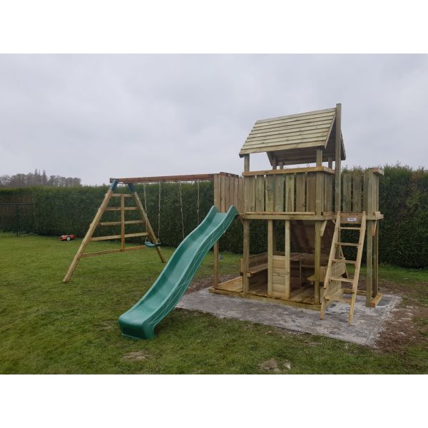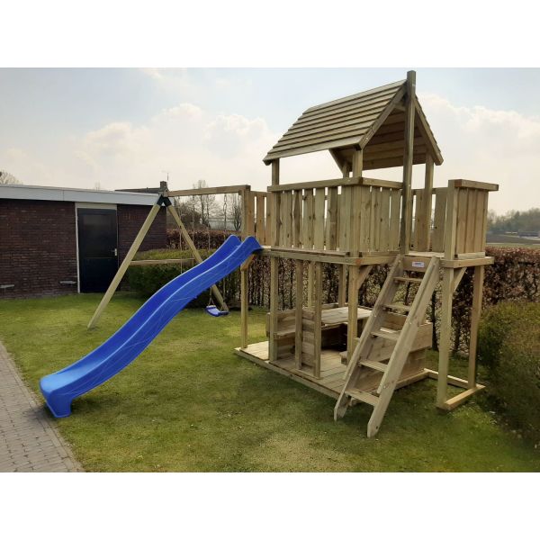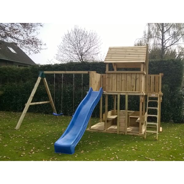 Helemaal compleet maakt u het speeltoestel met een aanbouwschommel of klimwand. De schommel kan gebruikt worden door jong en oud. Kleine avonturiers kunnen op ontdekking op bijvoorbeeld de schuine klimwand of het klimnet