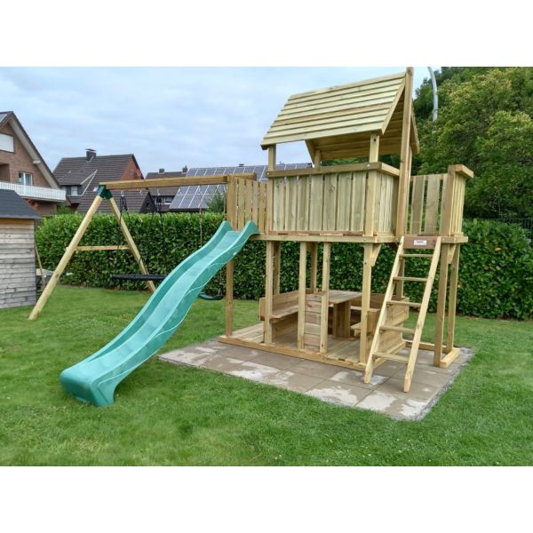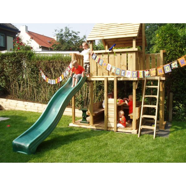 Prijs van het speeltoestel is inclusief een trap met handrails en een KBT-glijbaan, leverbaar in 8 kleuren