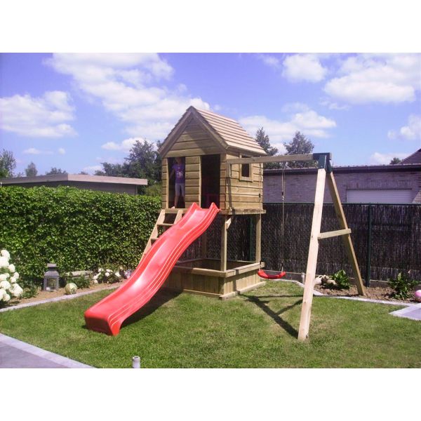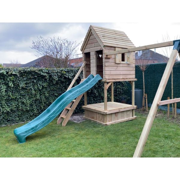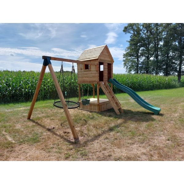 Boven is het speeltoestel voorzien van een dicht speelhuisje met links en rechts een raam. De onderzijde is voorzien van een zandbak. Optioneel is er een zandbakdeksel te bestellen om de zandbak af te dekken.