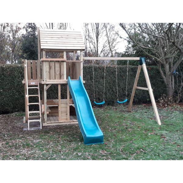 Het speeltoestel is geschikt om uit te breiden met een aanbouwschommel, klimwand of brandweer glijstang.