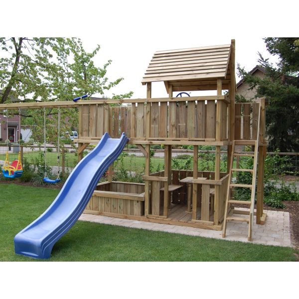 De onderzijde van de speeltoren is voorzien van een houten vloer en hekwerk. De ingang van het hekwerk zit aan de voorzijde. De zandbak is bodemloos.