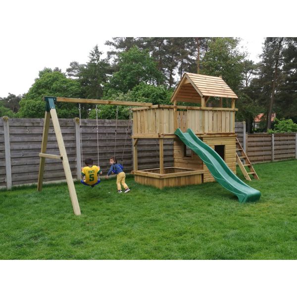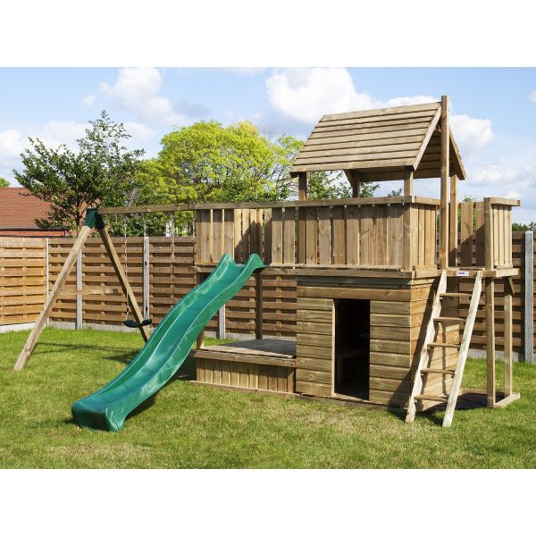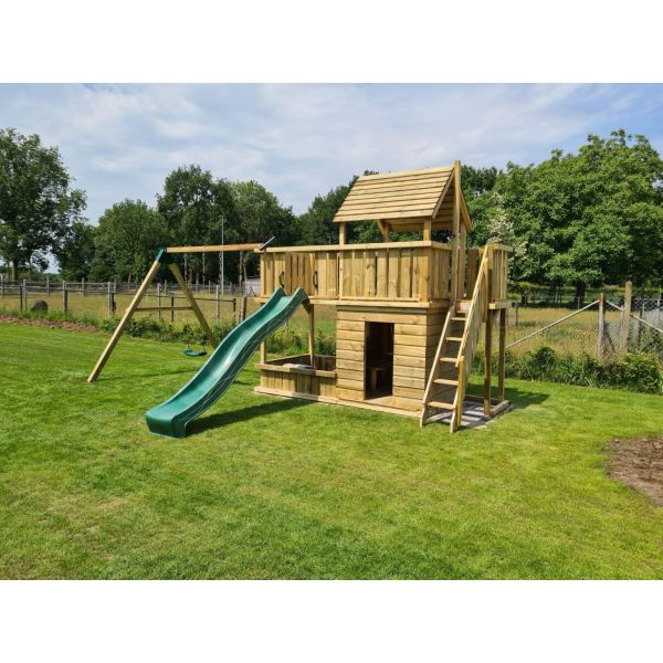 Deze speeltoren is aan de onderzijde uitgevoerd met een dicht speelhuisje en een zandbak. Het speelhuisje is uitgevoerd met 2 ramen en een deuropening. De deuropening is aan de voorzijde geplaatst. Aan de zijde van de zandbak en de achterzijde is een raam voorzien.
