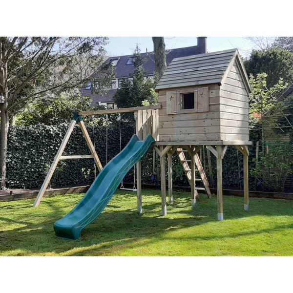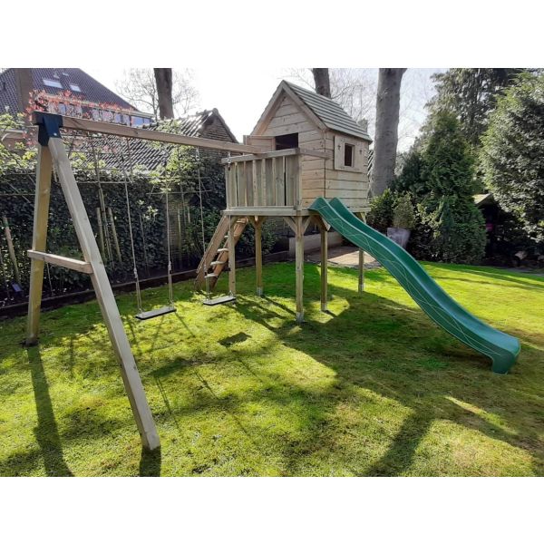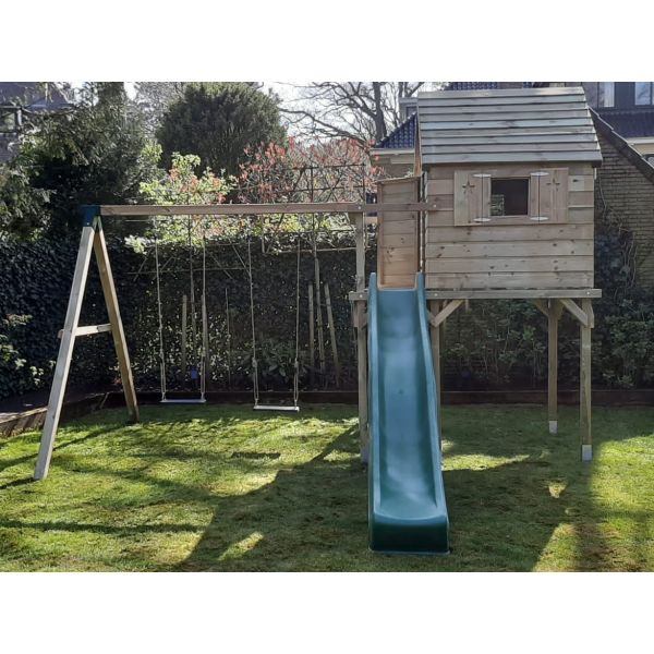 Deze speeltoren heeft afmeting 2.12x1.48m en is voorzien van een dicht speelhuisje boven met twee ramen en een deuropening. Aan de voorzijde van het dichte speelhuisje is een balkon gecreëerd. Hierdoor kan de glijbaan gebruikt worden zonder telkens door het speelhuisje te lopen.