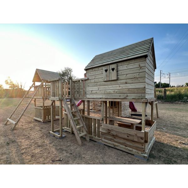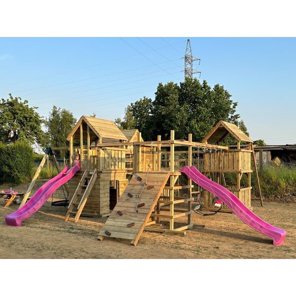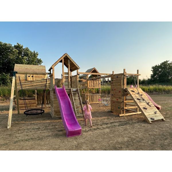 Het speeltoestel is samengesteld uit 4 speeltorens, allemaal met elkaar verbonden door bruggen of schommels. Deze onderdelen zijn standaard al ingevuld in het overzicht. Zelf heb je de mogelijkheid dit uit te breiden met leuke accessoires en schommelzitjes.